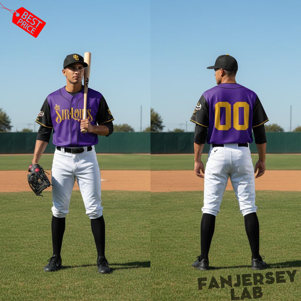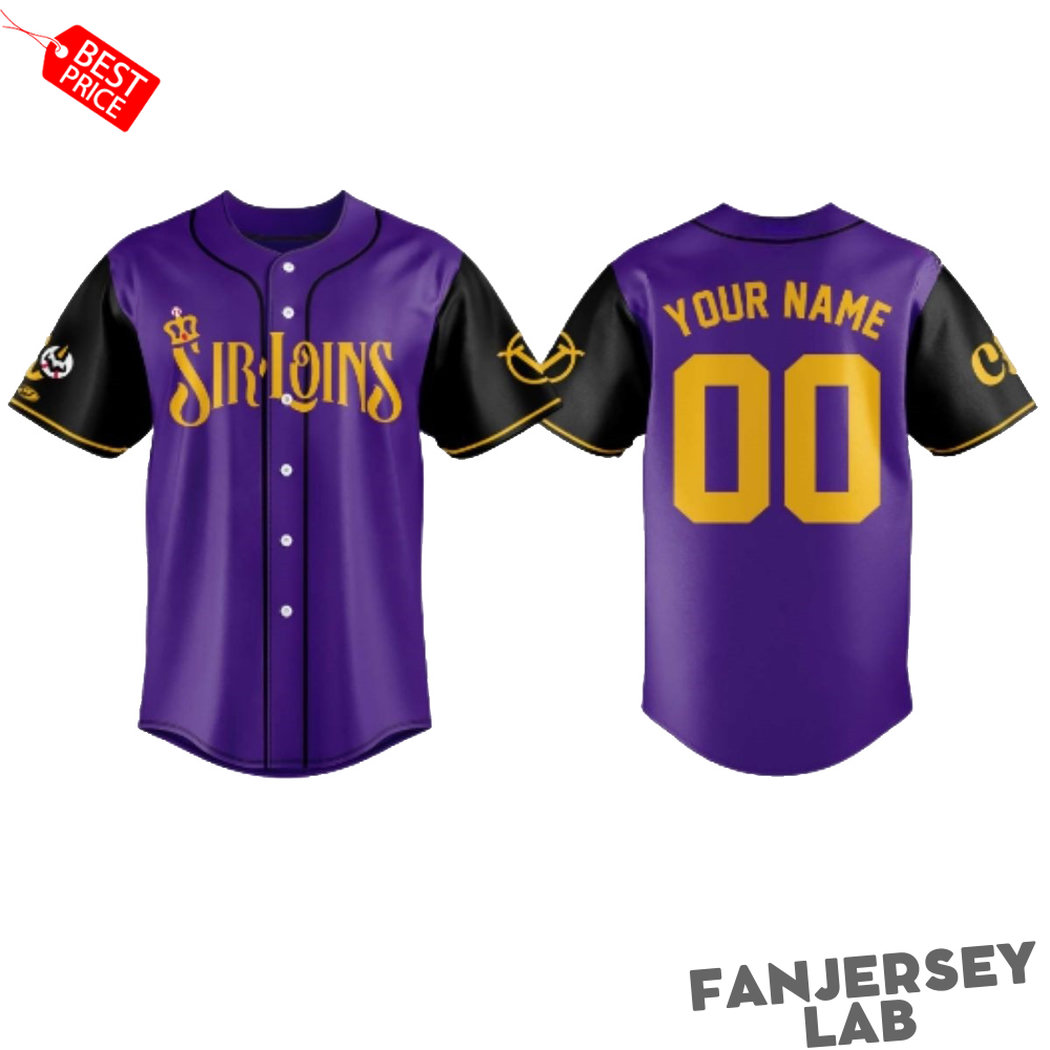 This vibrant purple baseball jersey features bold “Sir Loins” lettering across the chest in a classic script with gold and black accents. The back is fully customizable with “YOUR NAME” and “00” in large gold numbers outlined in black, giving it an authentic on-field look.