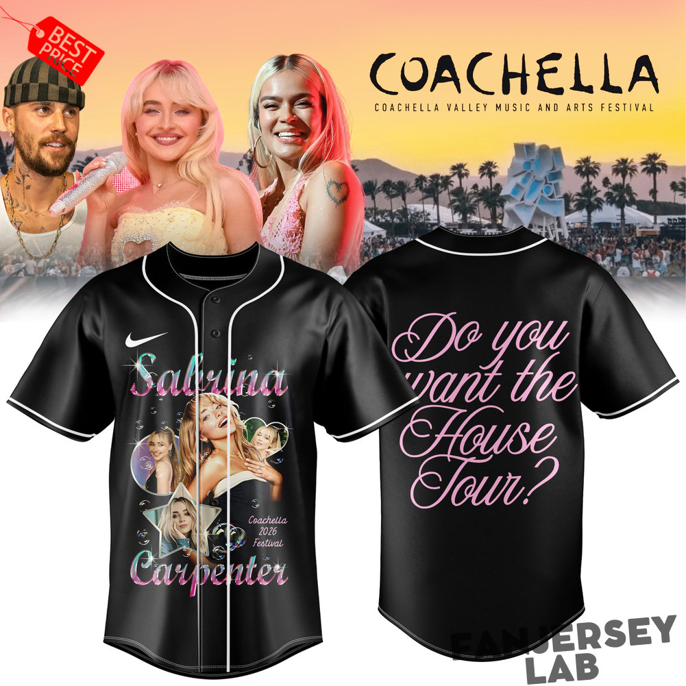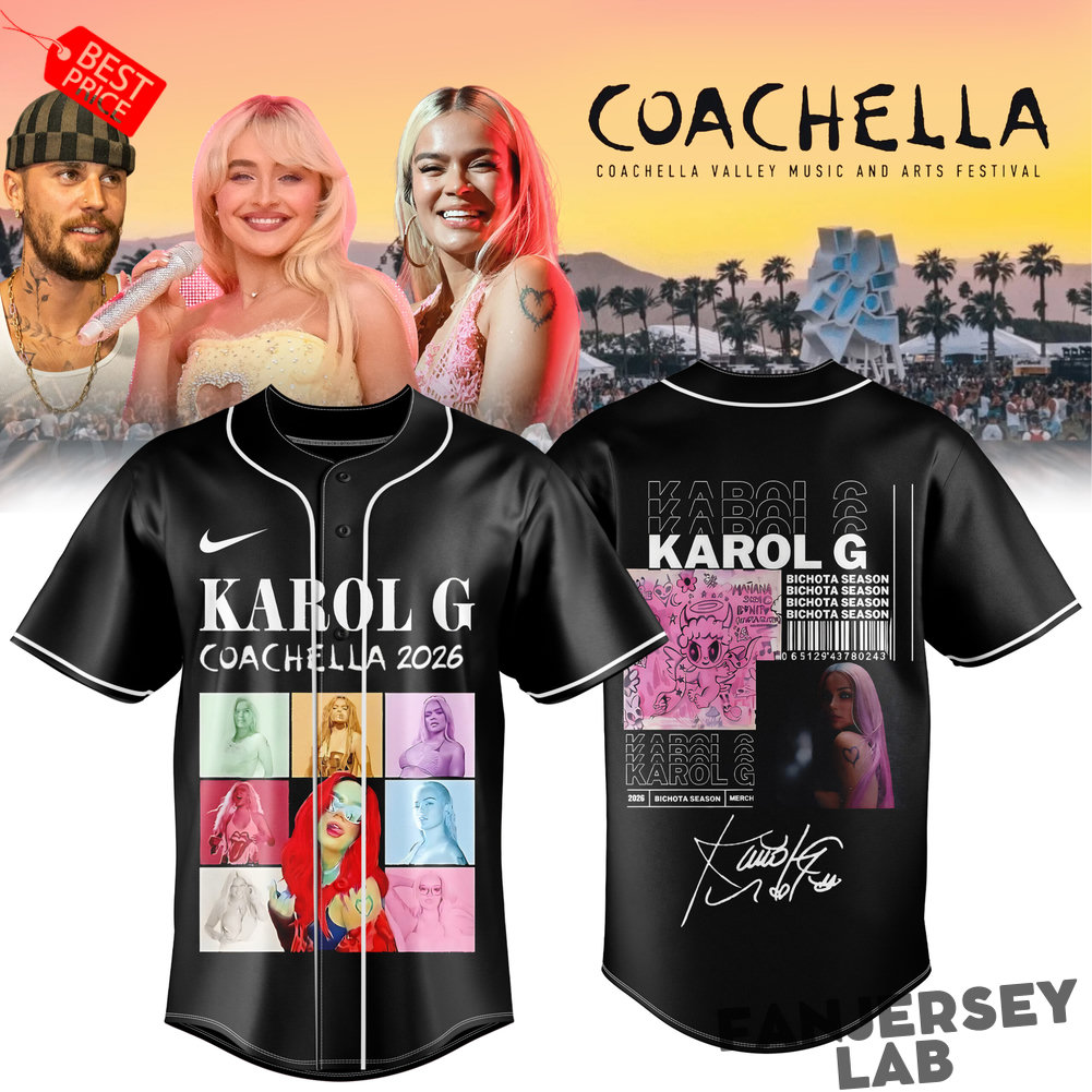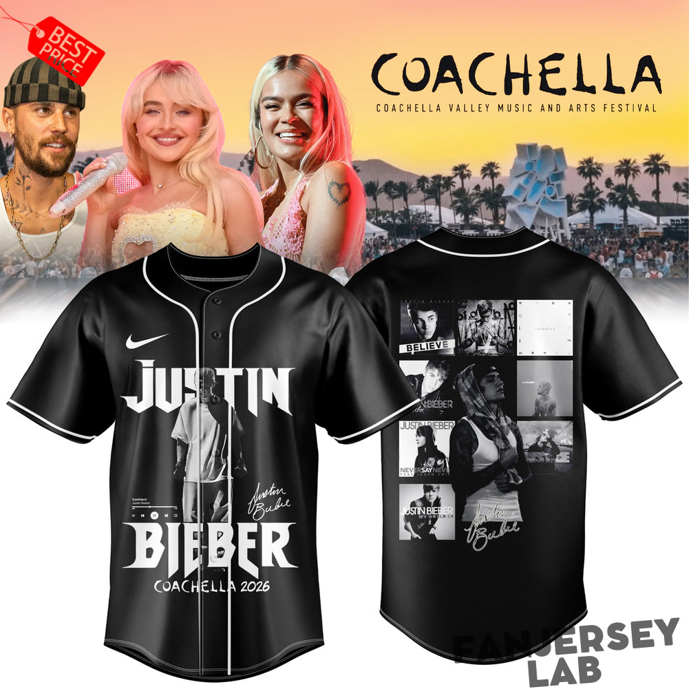 This sleek black baseball-style jersey captures the full Coachella vibe with a clean, modern design. The front features bold “JUSTIN BIEBER” or artist-specific graphics (depending on variant), while the back showcases a collage of iconic festival moments, stage performances, and the legendary Coachella Valley Music and Arts Festival branding.