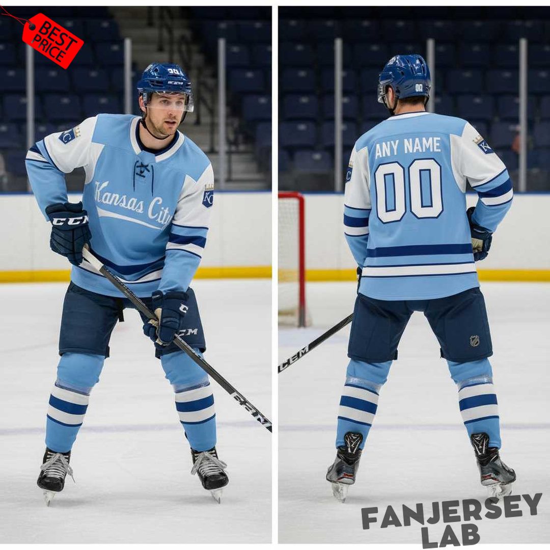 This sleek light blue jersey captures the clean “iced out” look with crisp white and royal blue accents. Across the chest, “Kansas City” is written in elegant white script, while the classic “KC” crown logo appears proudly on both shoulders. The design features bold horizontal blue and white stripes across the sleeves and waist, giving it a classic yet modern hockey aesthetic with unmistakable Royals flavor.