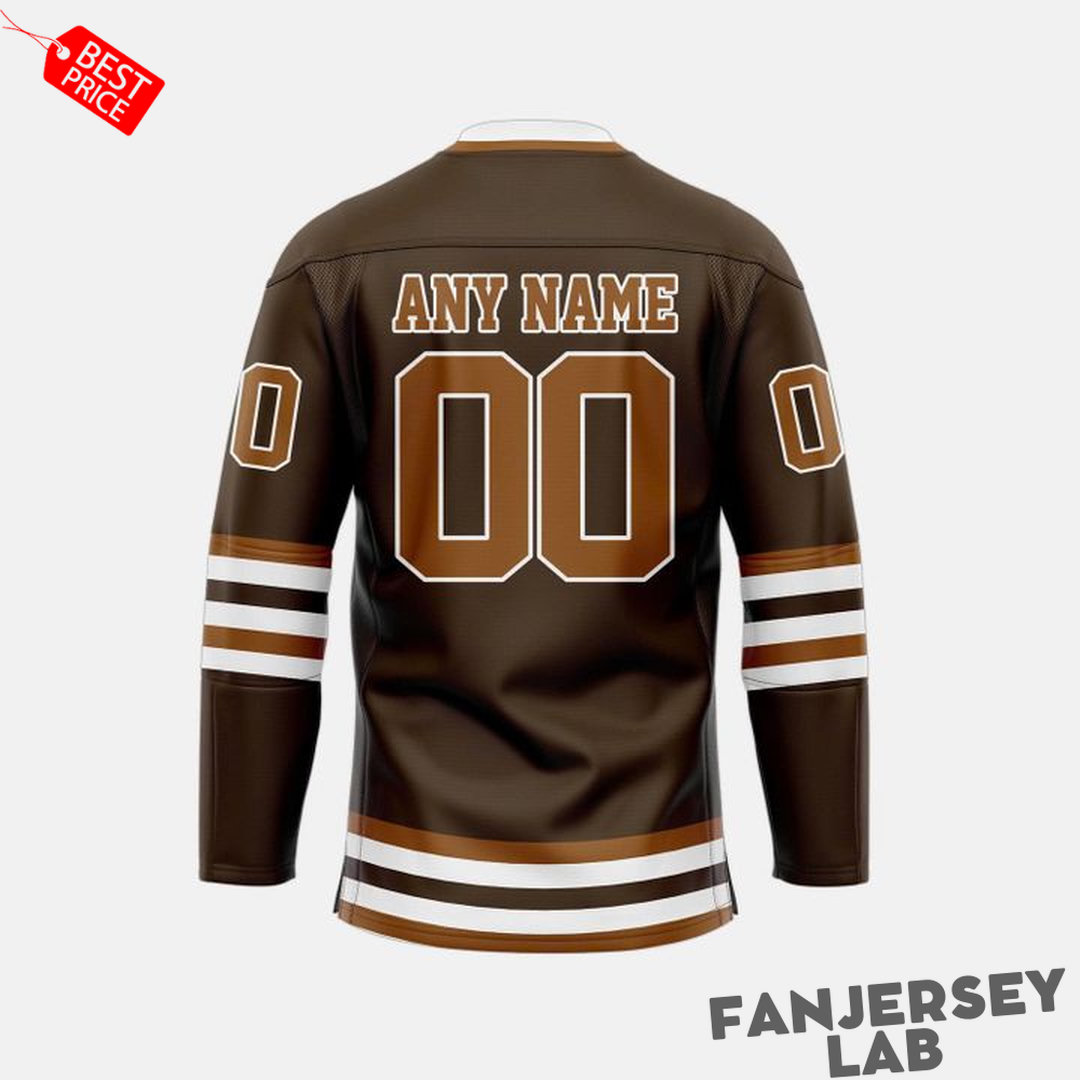 The back offers full personalization with “ANY NAME” and “00” in large white numbers with brown outlining, allowing fans to create their own custom jersey. Matching white and brown stripes on the sleeves and waist give the jersey a classic, professional hockey look.