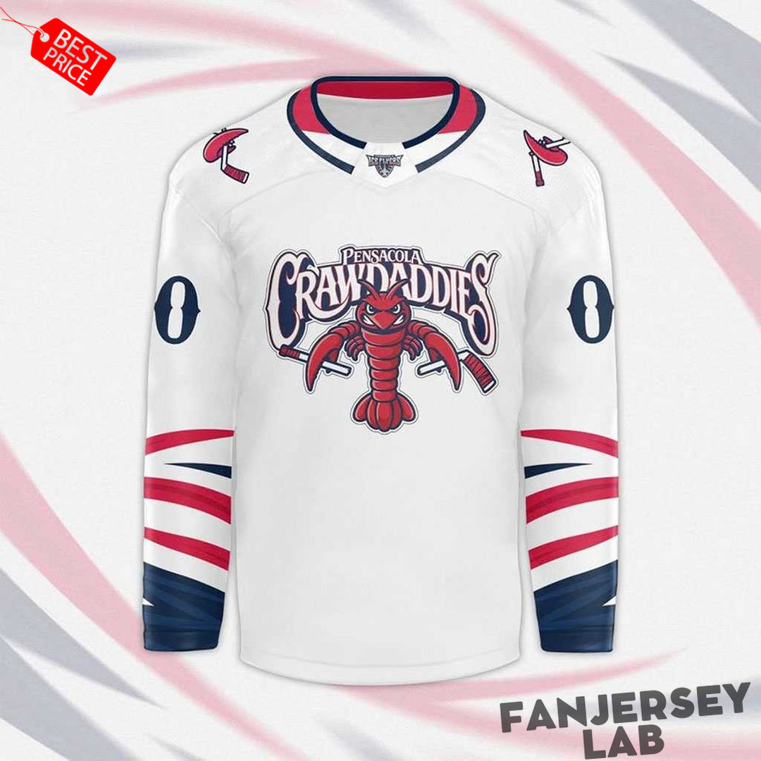 The design of the Pensacola Ice Flyers “Crawdaddies Night” 2026 Custom Hockey Jersey is defined by its striking white, navy, and “Crawdaddy Red” color palette. The front of this Pensacola Ice Flyers jersey features the official Crawdaddies primary logo: a fierce, hockey-stick-wielding crawfish ready for a face-off, set against a stylized “Crawdaddies” wordmark. This Pensacola Ice Flyers crest is applied using high-density sublimation, ensuring the colors remain sharp and vibrant through every wash, reflecting the professional standards of the team’s official on-ice equipment.