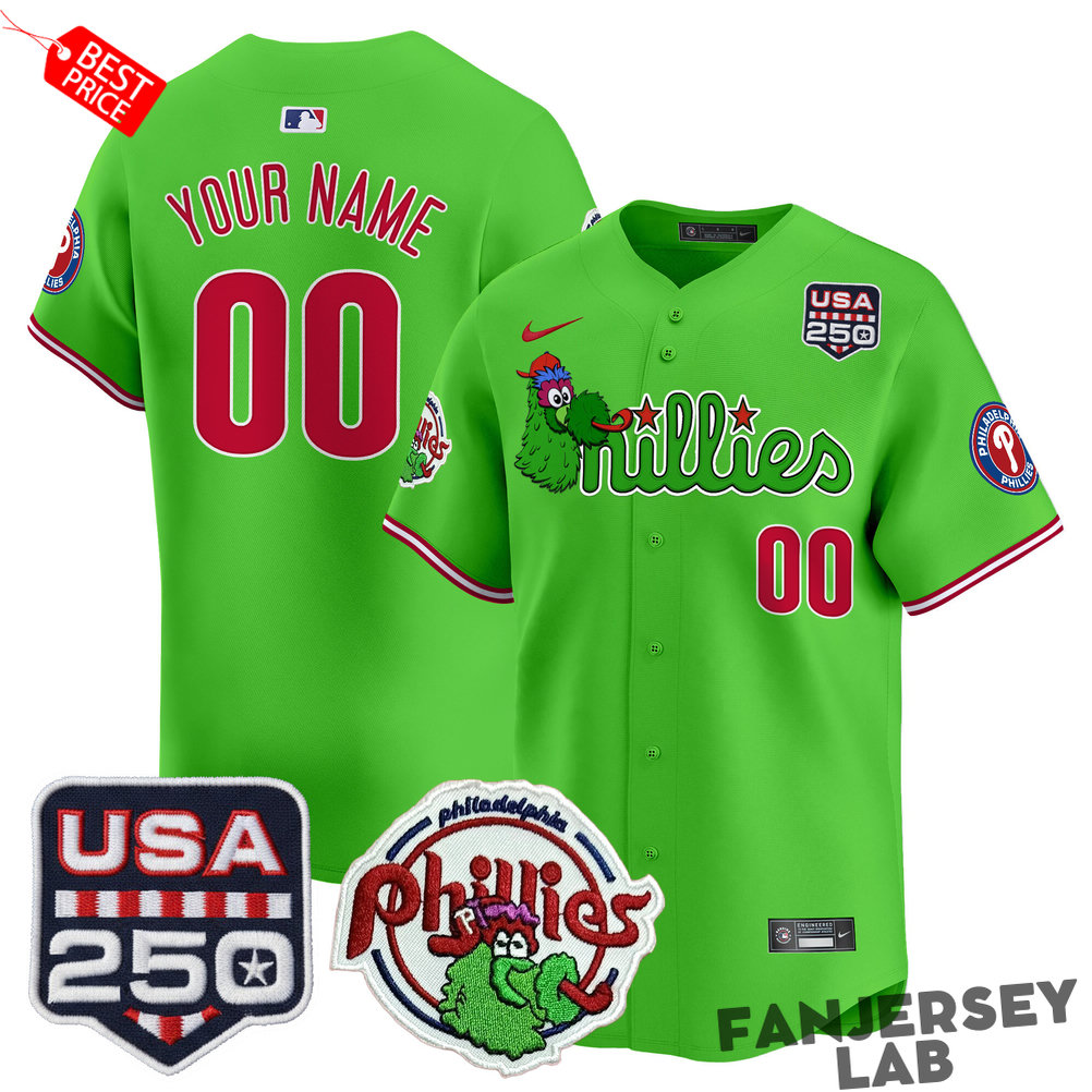 The primary white jersey features bold green “Phillies” script across the chest with the Phanatic mascot playfully incorporated into the lettering. Red and blue accents, including stars-and-stripes detailing on the sleeves and the “USA 250” patch on the right sleeve, complete the patriotic look. A special circular Phillies Phanatic 250America patch appears on the left chest.