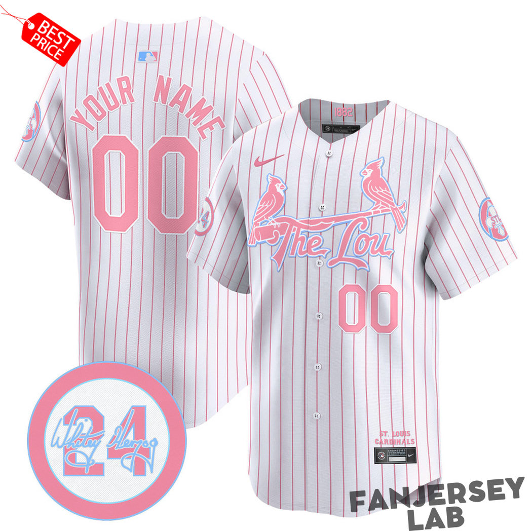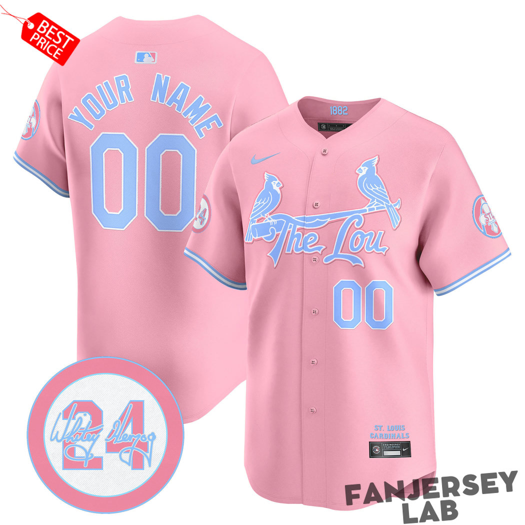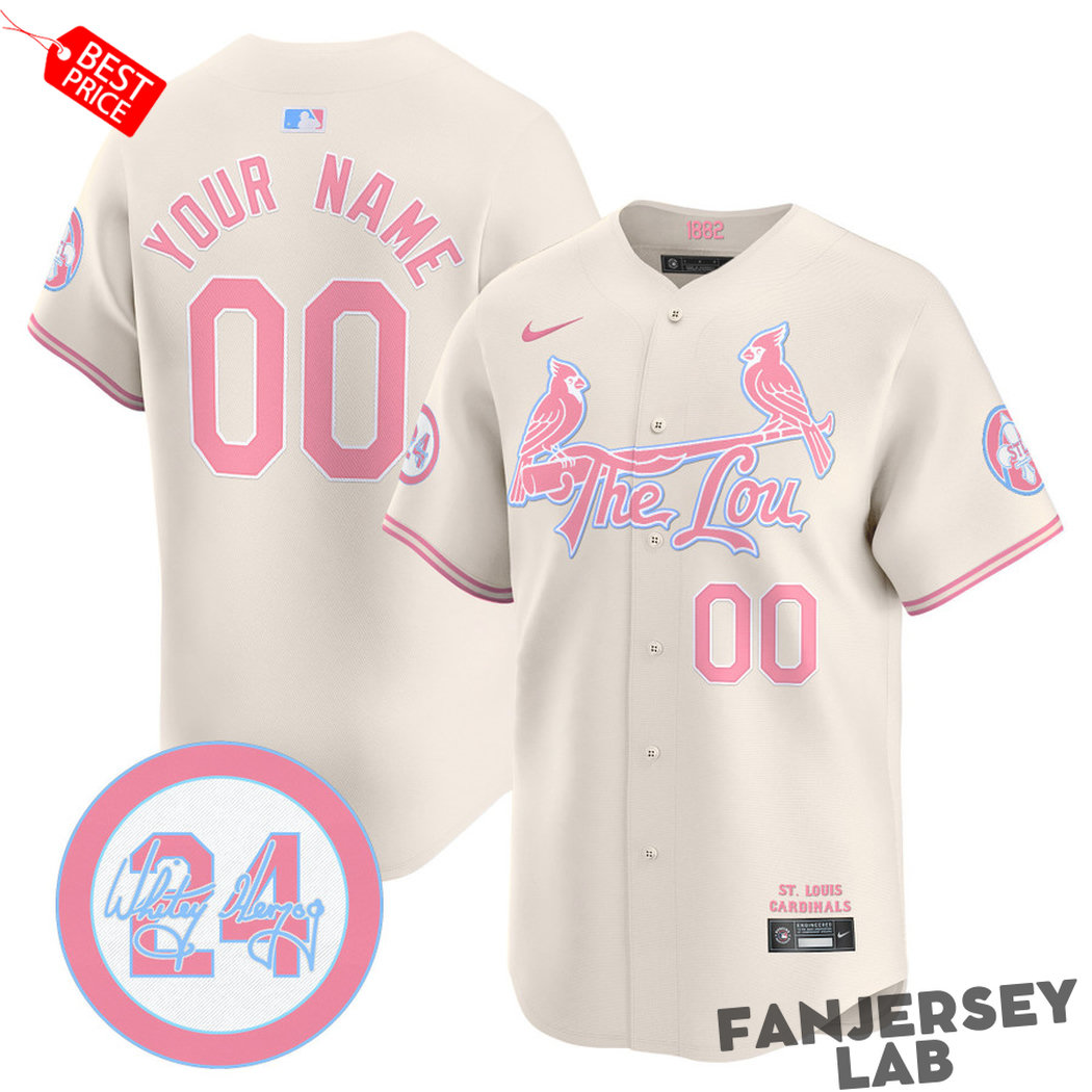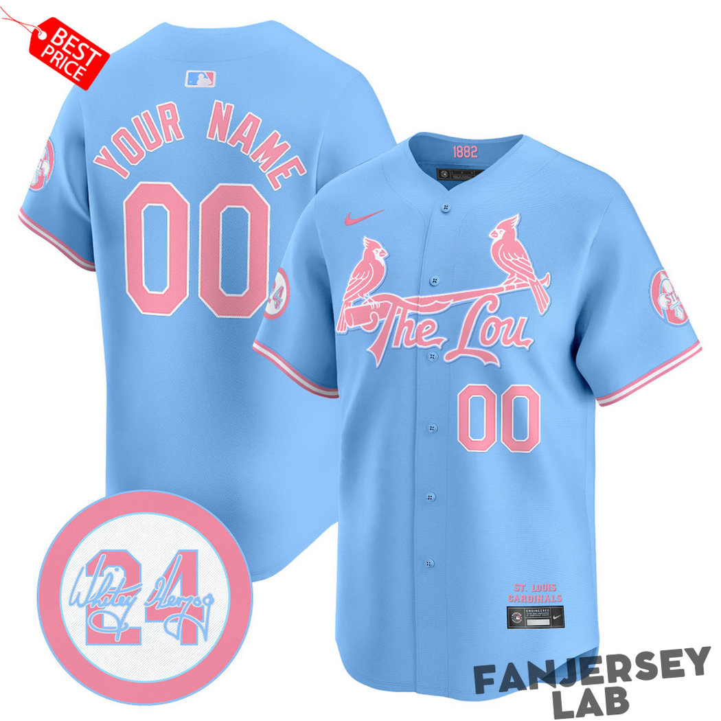This eye-catching jersey comes in dreamy bubblegum pink, soft sky blue, and clean cream colorways. The front showcases the iconic “The Lou” script in light blue with two Cardinals perched proudly on top, creating a fresh, fun take on St. Louis pride. The sleeves feature subtle team patches while the back offers full customization with YOUR NAME and YOUR NUMBER in bold lettering. A special “24” commemorative emblem adds extra meaning to this collection.