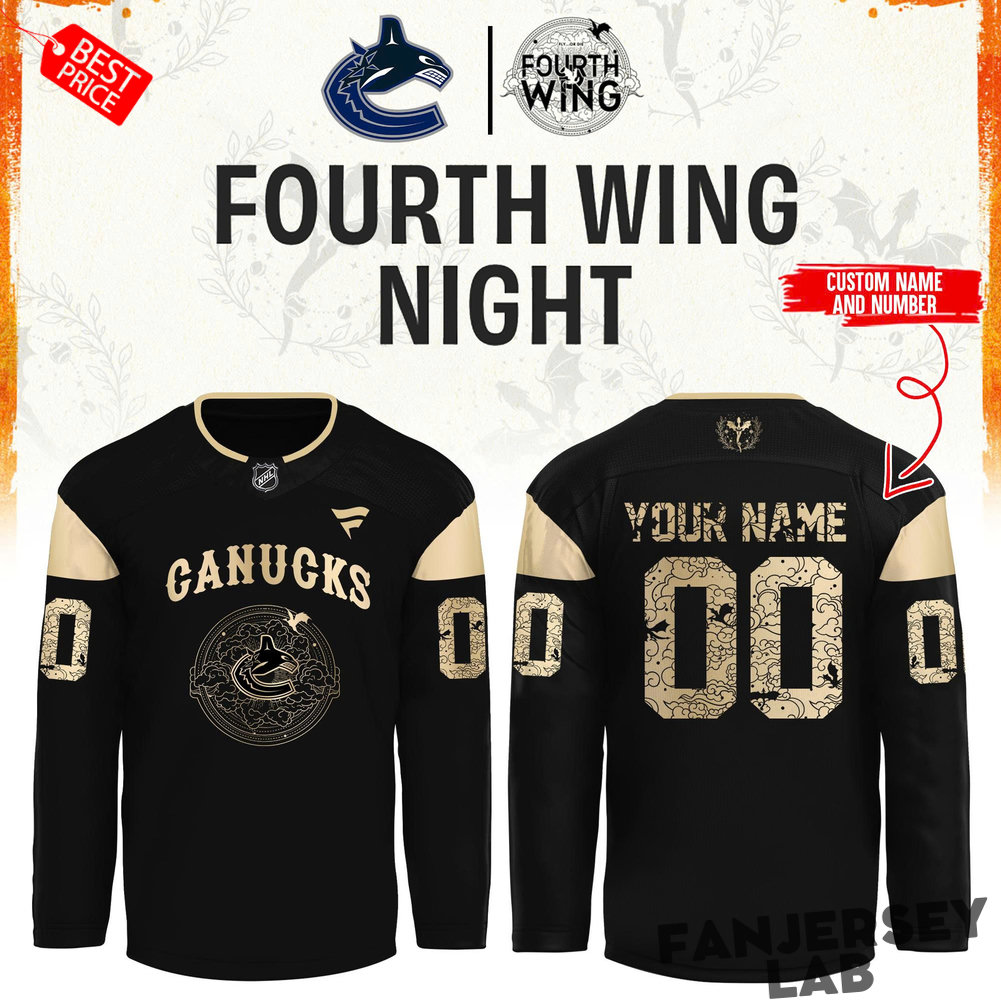Celebrate your passion for the Vancouver Canucks with this exclusive Fourth Wing Night Custom Hockey Jersey, specially designed for one of the most anticipated fan nights of the season. This premium black jersey features striking gold and beige accents that pay homage to the team’s iconic branding while adding a bold, modern twist.